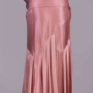 1 ashes of roses crepe back silk satin w/ elaborate swags & ties, asymmetrical bias wrap overskirt, label “Meeley, 2012 Walnut St. Philadelphia, Chantilly #1057”, B 34”, W 30”, L 58” w/ 68” tails, (few scuffs, few sm tears in net at collar, discoloration, 2.5” opening front left W, 0.25” dark stain CB bodice) very good; 1 pale pink crepe back silk satin evening dress, W panel twisted into decorative knot at CF below gathered & inserted diamond at CH, bias cut w/ inserted diamonds & bias inserted skirt, weights across CB interior, B 34”, W 32”, L 47”-53”, (shattering underarms, light discoloration & stains up to 4” around hem, frayed from lining removal at armscye & collar, 0.5” tear at lap seam) good. Deaccessioned by the Valentine Museum.