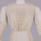 1 cream cotton lingerie gown w/ chemical imitation Irish crochet inserts, Schiffli broderie anglaise vertical panels w/ lace insertion & ruffled edging, c. 1911, B 36”, W 24”, L 55”, (rust stain CB W, sm scattered stains/holes); 1 sheer cream tea dress w/ floral pearl cotton embroidery & double leno weave bands, full slvs into fitted cuff, crocheted buttons to CF, label at petersham “Grande Maison Leblanc, New York”, c. 1917, B 42”, W 30”, (sm stain & holes); 1 cotton Schiffli broderie anglaise w/ chemical lace inserts, lace front bodice panel & slv cuffs, dorset thread buttons to CB, c. 1911, B 40”, W 27”, L 58”, (raw edge at W missing sash, light stains up to 2”, discoloration); all very good. Deaccessioned by the Valentine Museum.