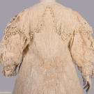 Multi-hued tape lace over floral patterned silk damask, chiffon ruching, pronged domed rhinestone buttons over pleated silk satin panaches paired at CF & as decoration at sleeves, turks head knot baubles, label “Laracy 11 West 26th St. New York”, c. 1912, SH-SH 15”, B 36”, L 45”, (lining damaged, minor discoloration ball trim, 0.5” stain CB lower skirt, minor tarnish, 2” repair front left H, few broken brides) very good. Deaccessioned by the Valentine Museum.