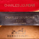1 pair red suede sandals w/ ankle tie straps, faux stacked leather heel, size 6.5, label “Charles Jourdan Made in Spain”, L 9”, Wd 3”, Ht 3”, size 6.5 AA, (missing heel caps, wear, few sm stains) good; 1 pair brown stilettos w/ extended cream passementerie straps to wrap around ankle & tie, faux stacked heel, label “Charles Jourdan Made in Spain”, L 9.5”, Wd 3.25”, Ht 4”, size 8, (heel caps missing, heels chipped, straps discolored, minor scuffs) fair-good; 1 pair cinnamon suede pumps w/ corded ties through rectangular metal edged lacing holes at vamps, label “Hermes Paris” & “Bonwit Teller”, 1970s, L 9.75”, Wd 3”, Ht 4.5”, size 8, (sole wear, 0.5” scratch inner left heel, few scuffs, light wear) very good. Deaccessioned by the Valentine Museum.