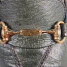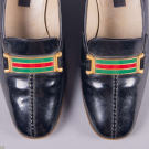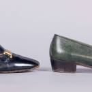 1 pair black patent leather w/ enameled inlaid brass buckles & heel detail in iconic Gucci green, red & green stripe, label “Gucci Made in Italy”, L 8.5”, Ws 2.75”, Ht 3.5”, size 5, (heavy wear to CB topline, moderate wear to soles, discoloration around buckle & vamp, minor scuffs) good; 1 pair forest green stacked heeled loafers w/ saddle stitching & equine brass halter fittings, c. 1957, label “Gucci”, L 9.25”, Wd 2.75”, Ht 4”, size 7, (moderate wear to soles, minor creasing/tarnish/scuffs) very good. Deaccessioned by the Valentine Museum.