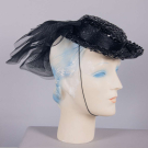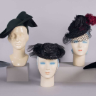 1 navy leghorn straw w/ grosgrain band & right CF bow, 1950s, label “Hattie Carnegie”, circ. 19”, Wd 15.5”, Ht 3.5”; 1 black fur felt & silk velvet w/ overlaid net crown, side bows of silk velvet ribbon, 1950s, label “Jean Robert Hats”, circ. 21”, Wd 16", Ht 4.5”, (repair CB brim); 1 lacquered black straw w/ horsehair ruffled & pleated panache at CB, label “Milgrim” & “Flint & Klint Buffalo”, circ. 13”, Wd 15”, Ht 5.5”, (minor shedding); 1 dark green fur felt w/ top-hat silk brim & tab trim, 1940s, circ 21.5”, Wd 13”, Ht 4”, (chinstrap broken, few snacks); 1 black fur felt w/ ostrich plumes, silk & linen face veil, label “New York Creation, size 22”, circ. 16”, Wd 11”, Ht 4.5”, (minor shedding), (all w/ sweat band discoloration) all very good-excellent.