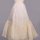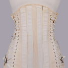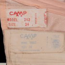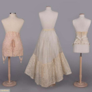 1 pale pink cotton & rayon corset w/ warp patterned roses on diagonal grid, label “Camp” Model 242, Sz 34”, W 32”, L 16”, (light 6” tidemark left seat, few light stains, elastic shot) good; 1 white buckram petticoat w/ guipure mm lace flounce, inserted ribbon, c. 1950, W 26”, L 41”, (minor discoloration, few tiny stains, 0.75” tear base of left SS closure) good; 1 cream cotton maternity or medical corset w/ elastic insets, elaborate multiple lacing w/ triple buckle at sides, label “Camp” Model 9667, Sz 30, unstretched W 24”, L 30”, (discoloration, heavy wear/tears up to 1” CF W, laces worn, wear spots up to 1”, repairs) fair.