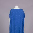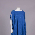 Blue cotton caftan dress in warp ikat pale blue variegated dot pattern, crossover front panel, SH seams opened, large patch pockets at Hs, label “Plantation”, B up to 44”, SH-SH 19”, L 51”, (light wear) excellent. Museum at FIT.
