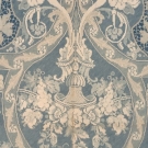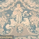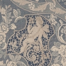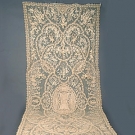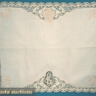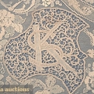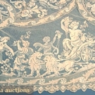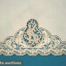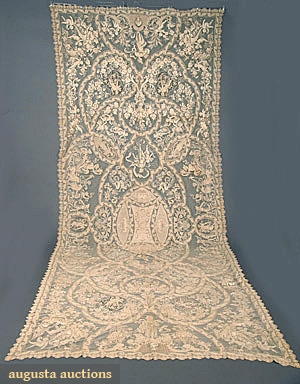 All over hand-done re-embroidered filet lace cloth & 2 doz. matching napkins w/ needlelace "KS" monogram, floral swags & figures, including scenes from antiquity of chariots drawn by lions & horses, at each end of cloth a classic female figure, 1of which is veiled, needlelace insertions w/ cherubs or female figures, center medallion w/ embroidered fruit filled urns, 68" x 178", napkins 18" x 22", (cloth w/ stains, few small mends) good.