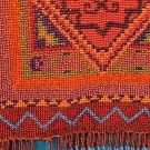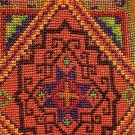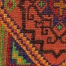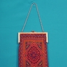 Brass frame & chain, crochet w/ beading in rust, brown, blue, & green, 6.5" x 9.5" plus 1.5" fringe, (tiny hole, small amount fringe missing) good.