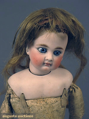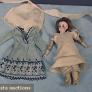 Joined kid leather body, glass eyes, pierced ears, bisque face & lower arms, w/ original pantaloons, chemise, embroidered dress & white apron, (back shoulder plate chipped, thumb missing from R hand, wig damaged) fair.