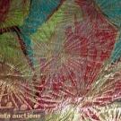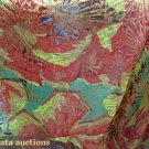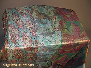 All on original mfgr.'s cards "Wullschleger & Co"; 1 large piece & 2 w/ 6 smaller colorway pieces: 1 card w/ 3 silver lame morning glories; 1 w/ 6 gold rose bouquets; 1 w/ 4 abstract poppies; smallest piece 8.5" x 9", largest 19" x 34",C. E. Mullin Colllection, (small holes) good.