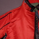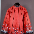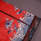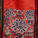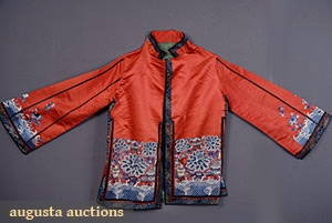 Red silk w/ blue & white embroidery of flowers and antiques, black silk seams and hem, L 31", Sh-Sh 17", Sleeve 25", C. E. Mullin Collection, good.