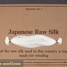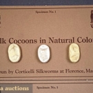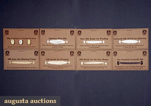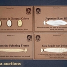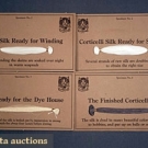 7 educational cards illustrating, w/ actual samples, the phases of silk production from cocoons to finished corded silk, 5" x 9", C. E. Mullin Collection, excellent.