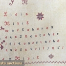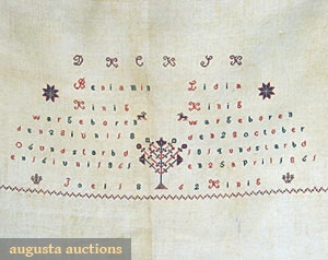 Red & blue cross stitch wedding sampler on homespun linen, "Benjamin Lydia Kinig", 16.5" x 65", excellent.
