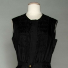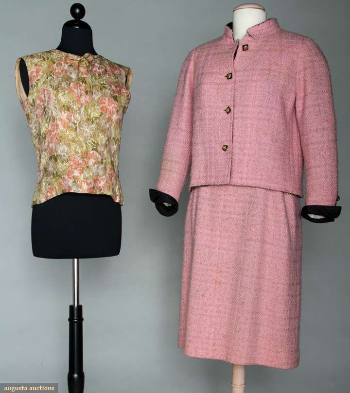 Unlabeled, 3-piece, pink handwoven wool jacket & skirt, attached black silk rouched front blouse & linings, square black silk buttons w/ gold metal lion heads, all hand finished & chain inside jacket hem, B 36", W 28", L 42", (blouse w/ 2" tear near armhole) very good; also w/ 1 unlabeled silk shell of gold brocade w/ pink & light sage print, matching tie belt, fair. Brooklyn Museum