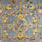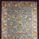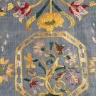 Panel either table cover or hanging: light blue silk ground, satin stitch & couched embroidery in polychrome silk floss, center lozenge w/ flowers & scrolls, mirror design on both sides of large flowers ,pair of birds & pair of stags, early 18th C. light blue brocade border w/ designs of large flowers & trees on island; embroidered panel backed w/ cream tabby silk, 66"X89.5", (mend in center lozenge, large amount silk floss loss) fair. CMA, VA