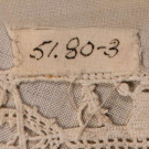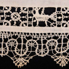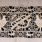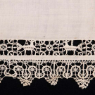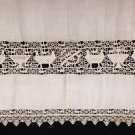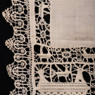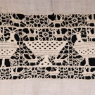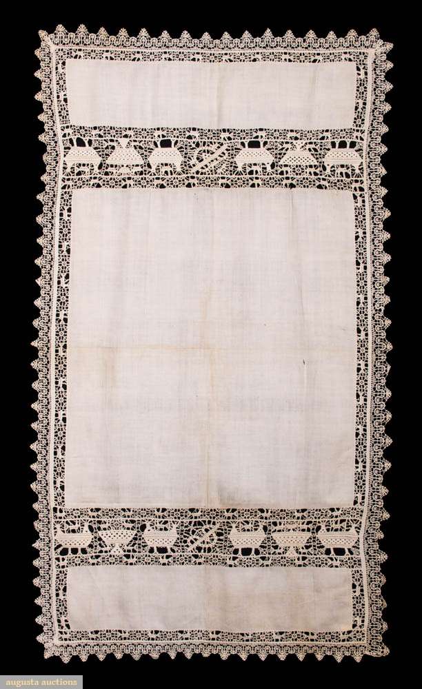 Tea cloth or table cover of bone linen w/ insertions of avian & footed bowl pattern bobbin lace near short ends & bird pattern bobbin lace border, bobbin lace punto in aria edge, 65” x 37.25”, (broad light discoloration: banded & foxing, few tiny-0.25” spot stains & tiny-0.5” tears, sm repairs up to 0.25”, few broken brides & pulls) very good. Provenance: Brooklyn Museum.