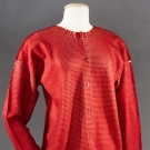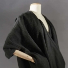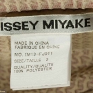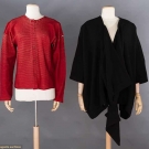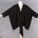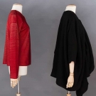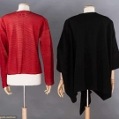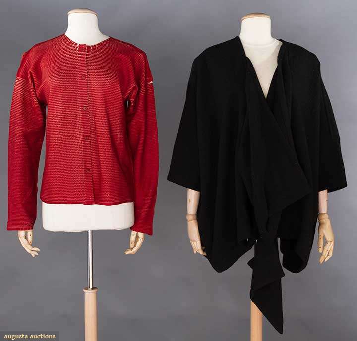 As shown on 1984 "Comme des Garcons" runway, 1 woven black wool blend tunic, voluminous width, very low draped neck, odd shaped projection hangs below CF hem, L 33" & 1 "Issey Miyake" puckered red polyester cardigan, B to 40", L 25", both excellent.