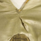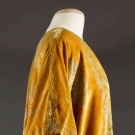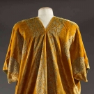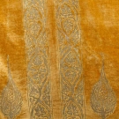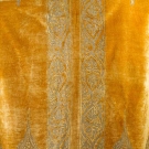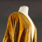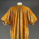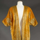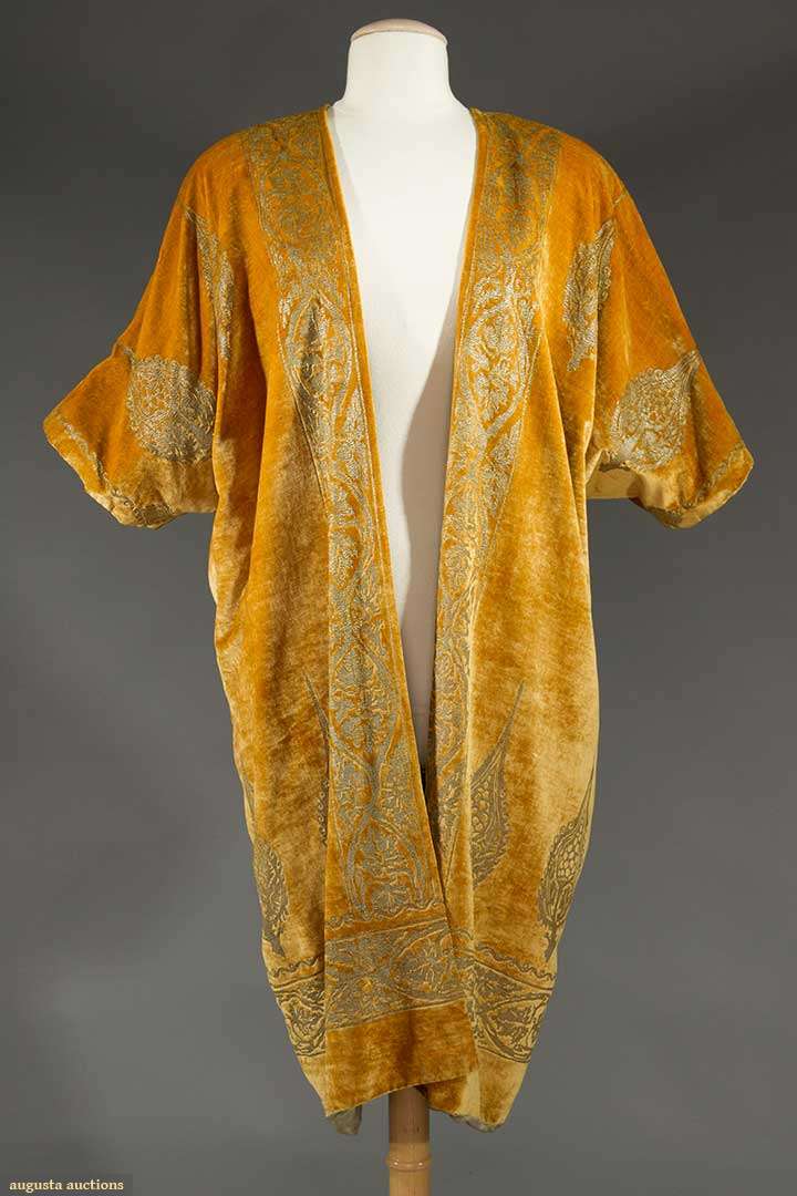 Silver gilt stencil in Persian patterns on golden brown silk velvet, open front, short sleeves, shallow V back neck, L 42", round label "Mariano Fortuny Venise", L 42", (alterations - shoulder pads added!, V back neck not original & w/ small repaired tear, hemline uneven w/ lining showing below velvet) fair.