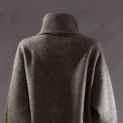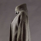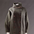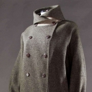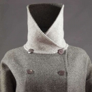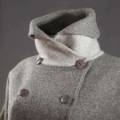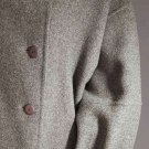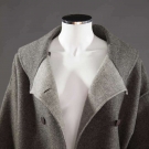 Dark grey double breasted wool coat, cuffed sleeves, coat interior & high cross-over collar reverse to light grey, L 47", (part of collar back seam unstitched) excellent.