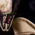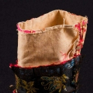 both pair embroidered: 1 pair floral embroidery on black w/ quilted white soles, excellent; 1 pair aqua slippers w/ mustard. Orange & white embroidery, disc-shaped heels added later, fair; t/w 1 single red & black lotus shoe w/ ceramic heel