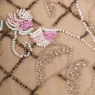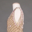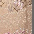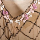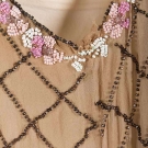 beige silk w/ pink, bronze & white chalk beading, B 40", H 42", L 41", (underarm stains & small tear, some bead loss), very good