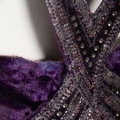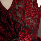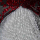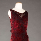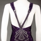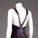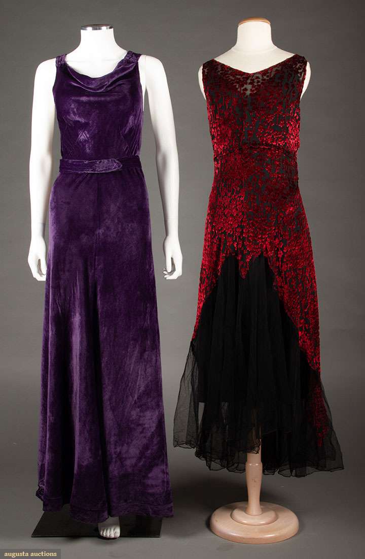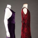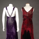 Both sleeveless: 1 red floral cut to black chiffon, pair black tulle CF & CB skirt gores, B 34", W 28", L 59", (hole in tulle); 1 purple w/ low back trimmed w/ small silver studs & crystal beads, B 32", W 30", L 49-55", (CB w/ small fade spot & small tear) both very good.