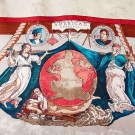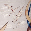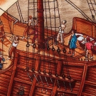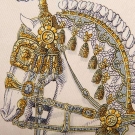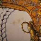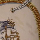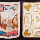 Both white silk twill, labeled & 35" x 35": 1 1992 "Christophe Colomb" in his boat designed by Carl de Parcevaux, excellent & 1 1962 "Grand Apparat" of horses & tack designed by Jacques Eudel, (stains) very good.