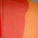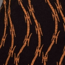 All from 1988 & labeled "Stephen Sprouse": 3-pc silk ensemble c/o sleeveless mini dress w/ chiffon long sleeve tunic & slender scarf in primary colored paint brush motif & scoop neckline, Tunic B 36", L 34.5", Dress B 34", L 38", Scarf 6" x 70"(tunic has stains at rear hem & tiny hole/stain at back right SH) scarf & dress excellent, tunic good; 1 high W wool mini skirt in black w/ orange razor wire motif, W 28", L 23.5", excellent. Lot 259 contains press information.
