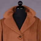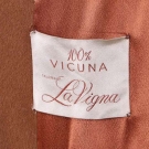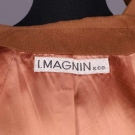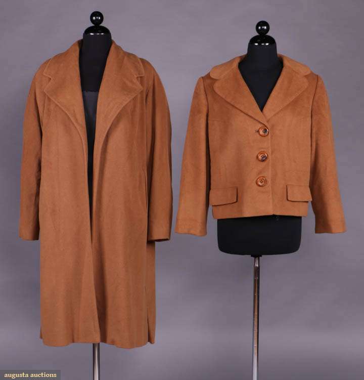 1 w/ wide lapel collar to open front, inset H pockets, long sleeve, lined in burnt sienna silk satin crepe, lining & hem hand picked, label "Julius Estess, First Avenue & Kahler Arcade Rochester, Minnesota" & "100% Vicuna, Tailored by La Vigna", B 51", L 40.5", (worn around seams & edges, label messily sewn upside down) good; 1 jacket w/ notched collar, long sleeved, decorative H pocket tabs, 3 CF button closures, lined in rose gold silk satin, label "I. Magnin & Co." B 42", L 21", very good- excellent.