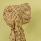 Checked linen in golden brown and cream, wide brim quilted for stiffening, corded where brim seams join gathered crown, deep bavolet, ties at chin and center back, all hand sewn, (fading and many holes) fair.