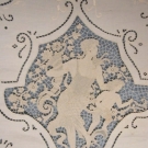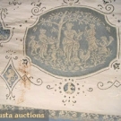 Extraordinary size: 82 x 280", fine cream linen lavishly decorated with cutwork and embroidery w/ large figural cartouches in needle & filet laces, including putti, Roman couples, musicians, w/ scalloped floral filet border, (some small foxing, & 1 stained area-see photo) otherwise excellent.