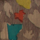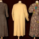2 unlabeled printed silk dresses, inverted-V front waistlines & V back waistlines: 1 1938 pale grey w/ plum stripes & colored leaves, deep V neck, puff sleeves, B 34", W 26", L 47", (back waistline unstitched .5"); 1 1948 slate blue w/ aubergine floralprint, deep-V F & B collar, 6 self covered back buttons, B 36", W 27", L 49.5", (fabric fading, 2" unstitched seam) very good; 1 1940 bone cotton coat, labeled, 4 fabric buttons at top, drop L 44.5", (hole on R sleeve) fair. BROOKLYN MUSEUM