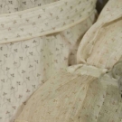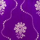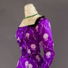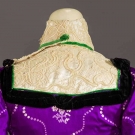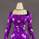 Both 2-piece: 1 purple silk foulard w/ stylized flower & dot print, bodice w/ lace yoke & high neck over satin, trained skirt, B 32", W 22", Skirt L 42"-45", (satin & lace bodice damaged, sun fading) fair; 1 tiny grey print on white cotton, maternity or nursing dress, jacket w/ no front closure, back peplum & tie belt to allow for size changes, B adjustable, W 29", Skirt L 41", (jacket faded, tie strings for cuffs missing) very good.