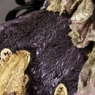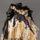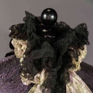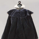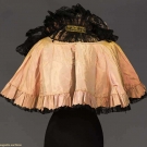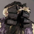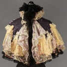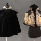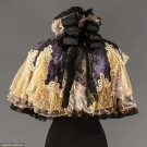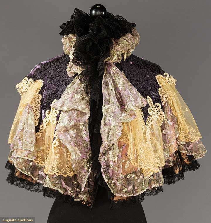 Purple sequins over-lap to form feather patterns on yoke above flounces of Alencon lace, printed ribbon woven white & lilac chiffon & black lace bottom flounce, high collar & front openings trimmed in chiffon & black lace, black silk gros-grain bows to back, changeante copper silk lining, label "Maison Emile Pingat A.Walles & Cie 30. Rue Louis Le Grand Paris", L 17", excellent; t/w 1 black velvet cape, high ruff collar w/ jet bead trim.