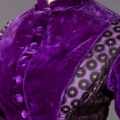 3 piece dress of purple silk w/ purple star blossom on black dot brocade, royal purple velvet jacket & skirt hem band, additional cropped evening bodice, B 38", W 22", (significant alterations to skirt & sleeveless top, crush marks to velvet by bust) fair; t/w 1 lady's red wool Zoave jacket w/ soutache trim.