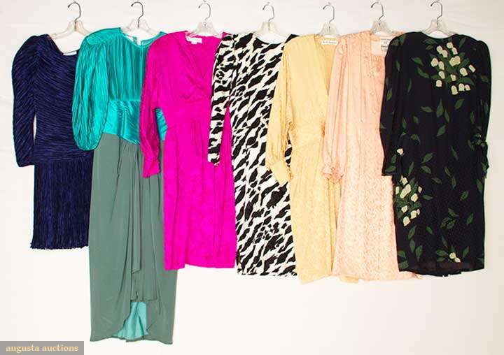 1 "Mary McFadden" sapphire, 1 "Acris" white & green print on black, 2 pink "Adele Simpson", 1 "Bruce Oldfield" turquoise, 1 "Andre Laug" yellow & 1 unlabeled black on white print, exc