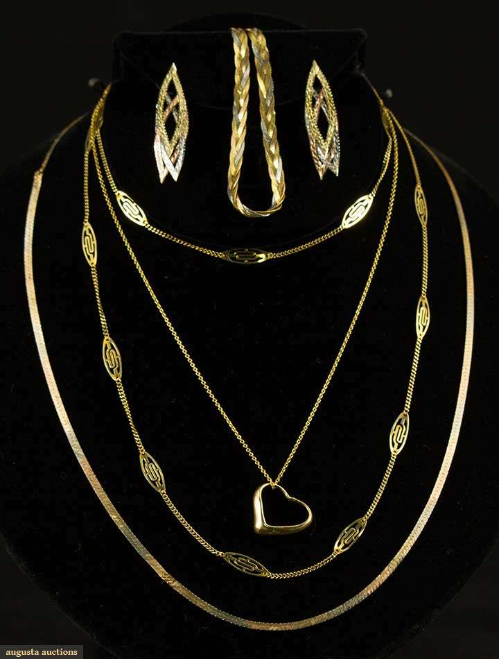 1 marked Elsa Peretti for Tiffany heart pendant & chain, 3 pieces tri-color gold: bracelet, necklace & earrings; 1 chain necklace
