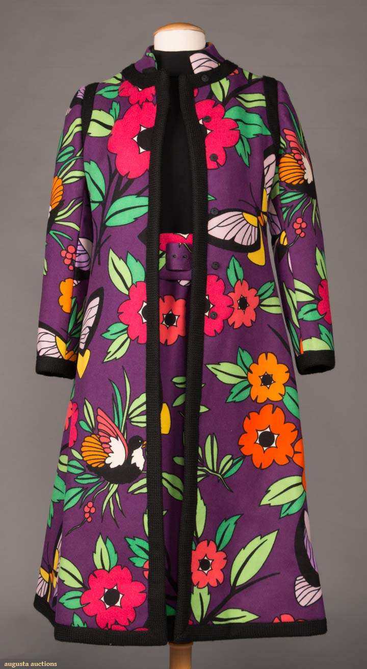 3-pc c. 1970 wool day ensemble in floral, bird & butterfly motif in purple, greens, red, orange & pink w/ black piping, ¾ length, long sleeve turtle neck dress w/ matching belt, side seam pockets on coat, couture detailing, pattern placement & handset zipper, labeled “Donald Brooks”, B 34”, W 26”, L 44”, excellent.