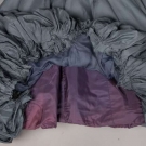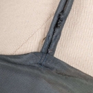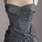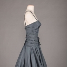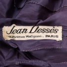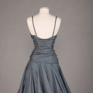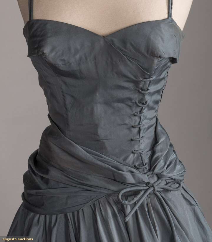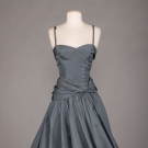 Silk Wedgewood blue evening gown w/ spaghetti straps, fitted bodice to swirled balloon hem, large stitching accent on left side of bodice to bow at self-sash, skirt lining stiffened w/ horse hair, couture construction, labeled "Jean Desses", B 34", W 32", L 47", (right strap cord exposed, left W let out, hem altered & fallen, seam opening at left B strap, 0.25" hole at right B seam) fair.