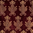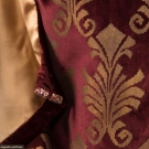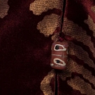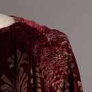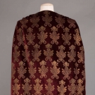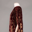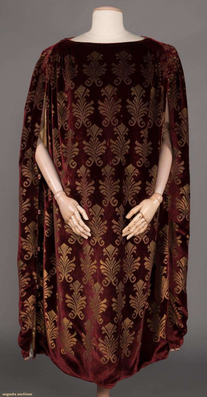 Maroon velvet mantle w/ gold stenciling in abstract floral, boat neck to gathered SHs, open sides tacked w/ 4 terracotta & white ceramic bead, additional bead accents at SS hem, lined in gold silk, possibly early Gallenga- relined &/or modified,free size, L 49", (1 missing bead at hem, crush marks & light stains throughout) very good.