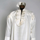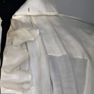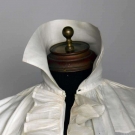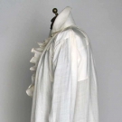 White linen, CF ruffled opening, high stand collar, L 35", (few small holes in back) very good.